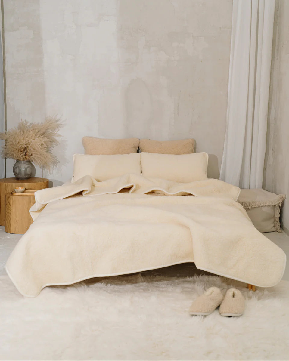 La lana è più di un semplice materiale. Respira, mantiene la sua forma e diventa ancora più morbida con il tempo. A differenza delle fibre sintetiche, una coperta in pura lana merino offre un comfort duraturo su cui puoi contare — stagione dopo stagione.